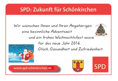 Wir als SPD-Ortsverein wünschen allen Bürgerinnen und Bürger ein friedliches, ruhiges und schönes Weihnachtsfest im Kreise von Familie und Freunden. Genießen Sie die Feiertage um das Jahr 2017 Revue passieren zu lassen, an schöne Momente zu denken und vielleicht schon das eine oder andere Vorhaben für das neue Jahr zu planen.
